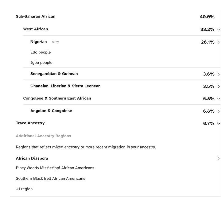 My DNA also says that I am African. I have deep roots in West Africa, largely in Nigeria, among the Edo and Igbo people. It feels like a privilege to know that, as if I carry honor in my bones.